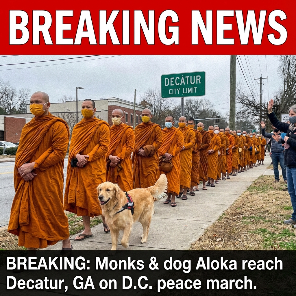 BREAKING: Two dozen Buddhist monks and dog Aloka reached Decatur, Ga., en route to D.C.; thousands welcomed them. What do you think? Comment. According to AP